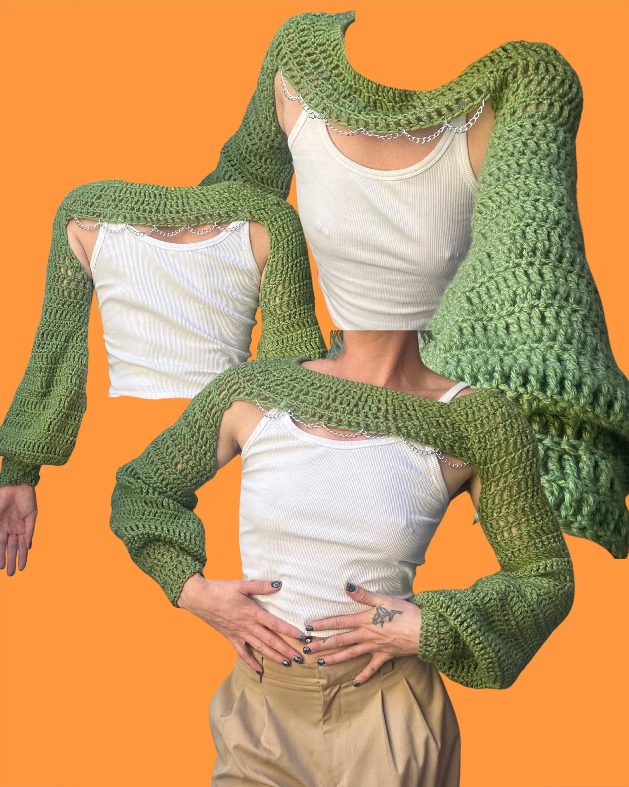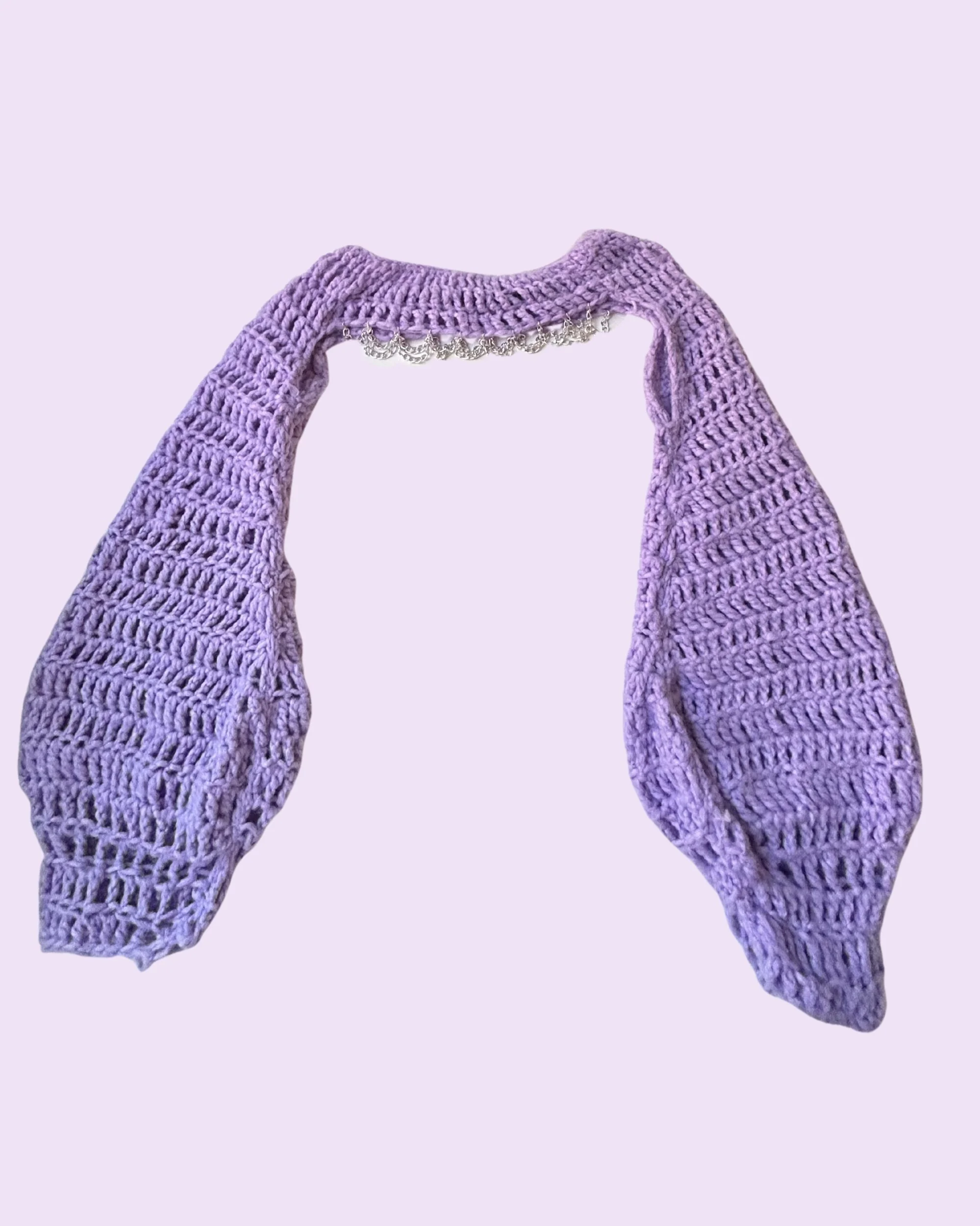 Handmade, crocheted lavender body-less jumper with metal detailing. Acrylic/polyester blend.