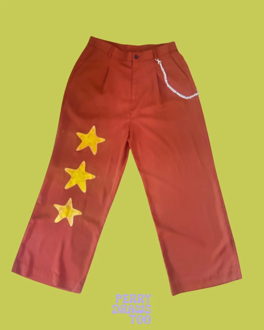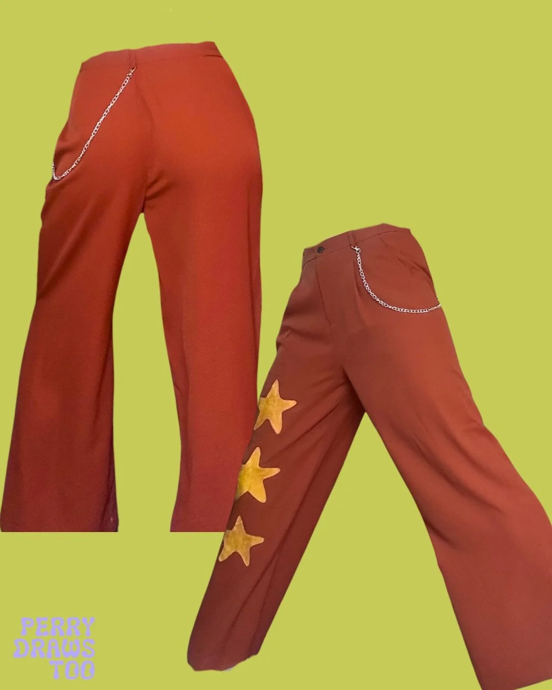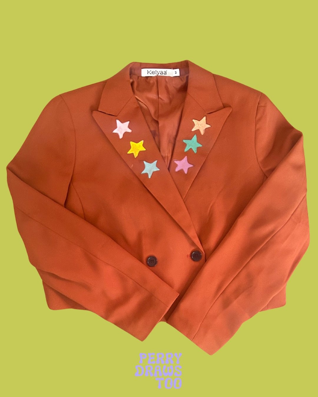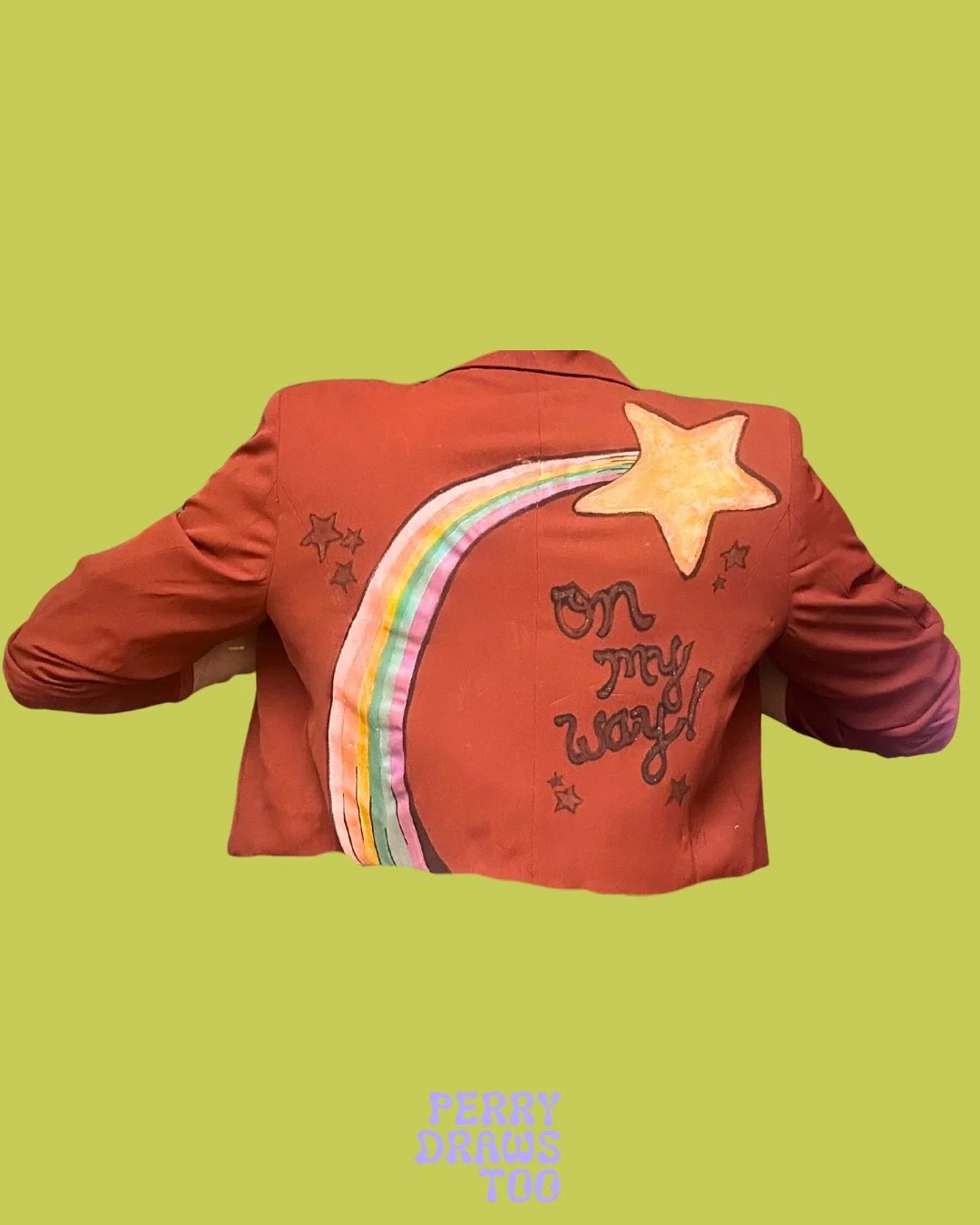 One-of-a-kind burnt sienna suit hand painted with star detailing. Back reads “On my way!” Suit pants feature a removable silver chain.