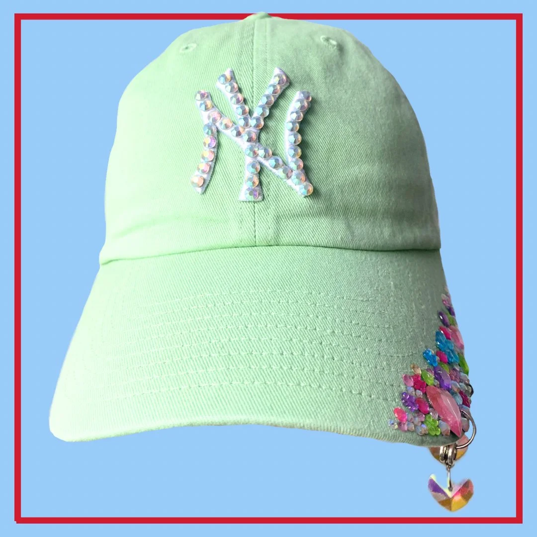 NY Yankees ‘47 baseball cap. Bedazzled by hand, features hanging heart charms and hidden adjustable strap in back.
