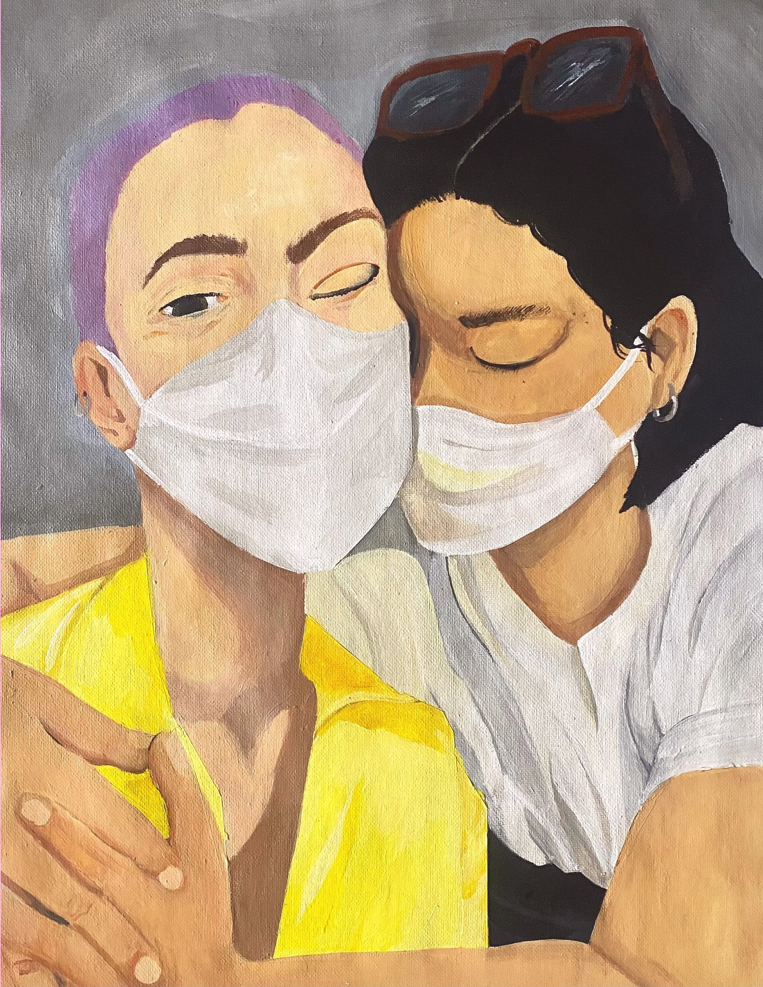 The title “The First Hug (Masc Love)” is multifaceted and its concept one that is close to the artist’s heart. Created from a time of unparalleled global upheaval, this piece marks the first hug between two best friends, once physically distanced by COVID-19. “Masc Love” is a play on words, referencing the masks central to a global pandemic, and also the love between two masculine (“masc”) individuals. A love between mascs is a liberating love, a love that returns a masc to a self love, a love for their community, and a love that allows for vulnerability of the platonic nature. When a masc - especially a transmasc - is loved by another, it is a love like no other.